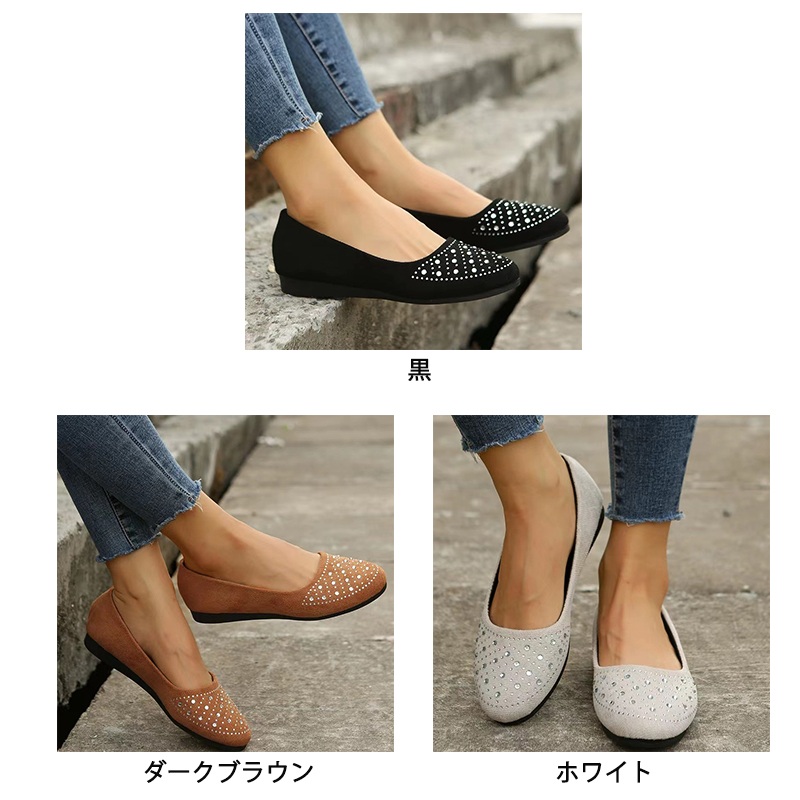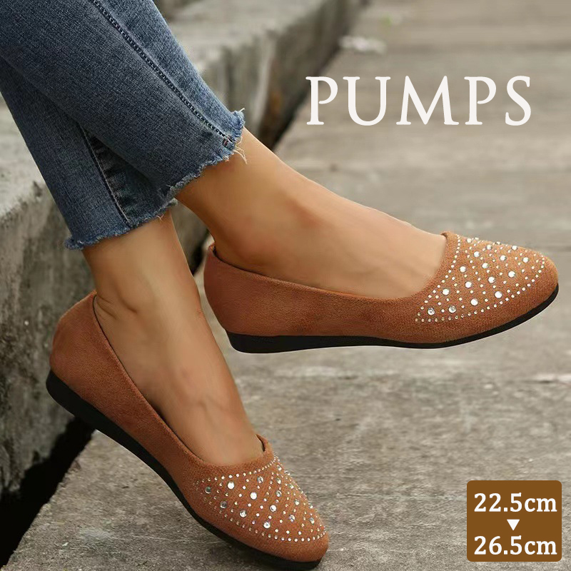 ■コメント ・足元が華やかになるラインストーンパンプス。 ・脱ぎ履きしやすいスリッポン。 ・ぺたんこで長時間の着用でも疲れにくいです。 ・普段使いしやすくロングシーズン活躍できます。 ・耐摩耗性&滑り止めアウトソールで安心安全。 ■サイズ(単位:約cm) 22.5cm(35)―26.5cm(43) ■カラー 商品画像に記載 ■素材 合成皮革、合成底